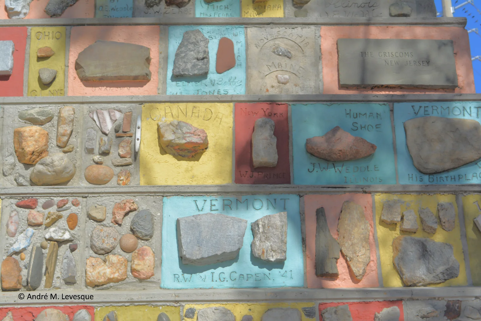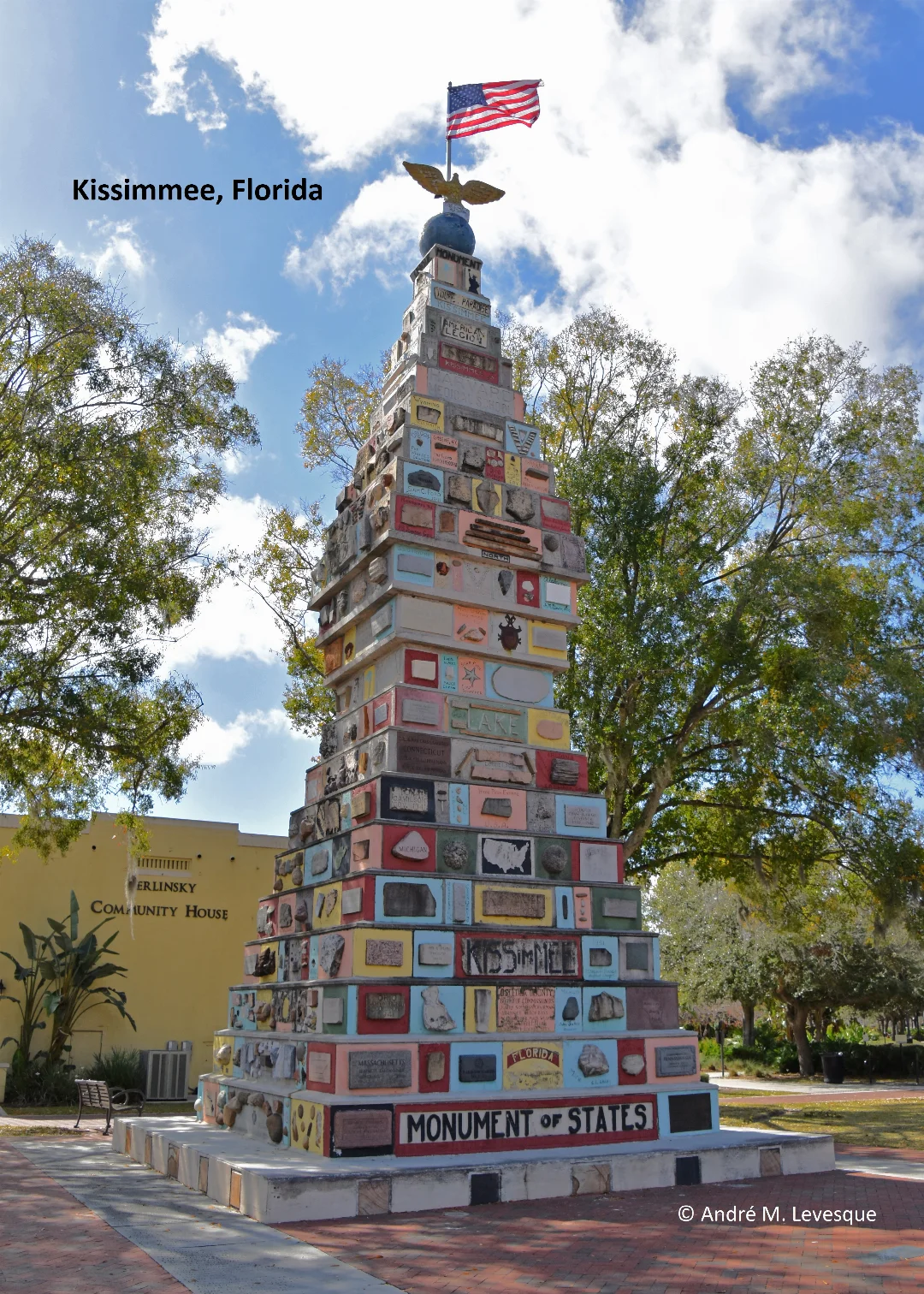 Designs for an attraction monument to improve local tourism in Osceola County were conceived as early as September 1941 but the planning for a commemorative 'Monument of States' was a response to the attack of Pearl Harbor on 7 December 1941. Dr. Bressler-Pettis partnered with J.C. Fisher to design a monument that would stand as a symbol of American unity in a time of international crisis. The cornerstone was laid on 11 January 1942 and the construction of this vernacular work of folk art was a massive community undertaking with the assistance of the Kissimmee-All-States Tourist Club, local organizations, businesses, churches and local residents who donated labour and materials. The monument was officially dedicated fourteen months later on 28 March 1943 by U.S. Senator Claude Pepper (8 September 1900 - 30 May 1989). As shown in the photograph, the Monument of States is an irregular quadrilateral step-pyramid that is composed of 21 varying tiers. The monument's concrete foundation is 3 feet thick and 22 square feet in size and supports the monument's estimated weight of 100,00 pounds and is reinforced with 3.5 tons of steel rails. The monument stands at 50 feet tall and is crowned with an American Bald Eagle with a wing-span of six feet perched on a three foot concrete sphere. At the outset of the planning stage, Dr. Bressler-Pettis wrote letters to state governors asking for rocks from their states. President Franklin D. Roosevelt sent a stone from his Hyde Park estate, and so did Governor Rexford Guy Tugwell from Puerto Rico and Prime Minister William Lyon MacKenzie King from Canada. Donations received also included fossils, chunks of quartz, blocks of native granite, parts of old buildings, petrified wood from Arizona, a meteorite, a palm tree, a cannonball from Michigan, bottles, buffalo horns from Montana, a human skull, a rock from the Sahara, glacier eggs, a petrified apple from Wisconsin, and much more. In all, Bressler-Pettis had collected over 23,000 stones. Beyond the states' official contributions, Bressler-Pettis included hundreds of stones he and his wife had collected from their prior travels across the United States. At the time of dedication, the monument consisted of 1,500 stones from 48 states and 21 countries. Rocks continued to arrive after the dedication, including from the later states of Alaska and Hawaii, and were attached to surrounding walkways. Over time, the monument became a prominent tourist attraction and was promoted as "The World's Most Unique Monument" but interest dwindled after the 1971 opening of Walt Disney World in Orlando.