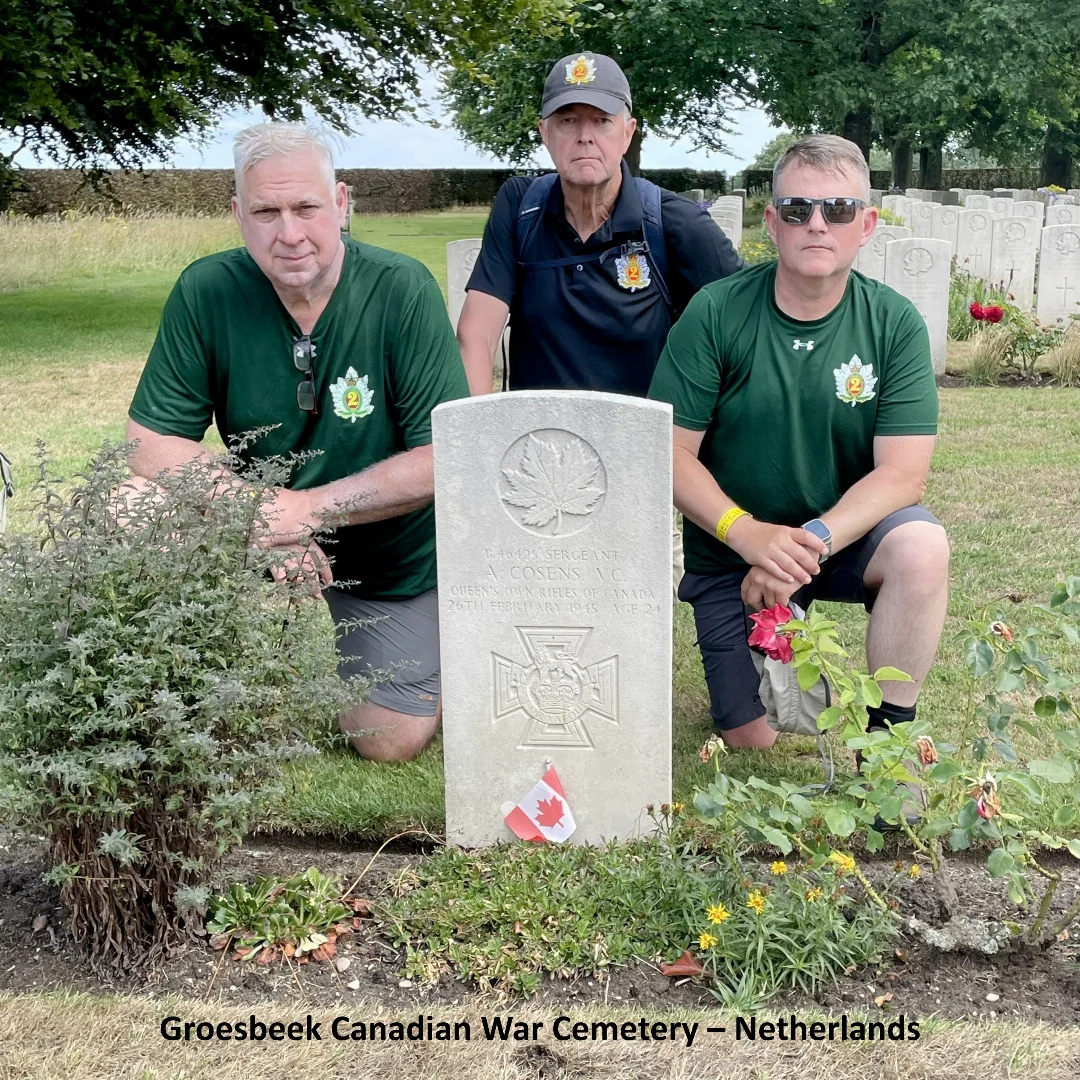 As shown in the photograph, the 24-year old Sergeant Cosens is buried at Groesbeek Canadian War Cemetery, Netherlands. As part of the 107th edition of the Nijmegen Four Days Marches held during July 2025, many of the military detachments and individual participants stopped along the route to pay their respects at the grave of our Victoria Cross recipient. This includes (from left to right) Warrant Officer Philip Ten Kortenaar, C.D. (Retired) of the Queen's Own Rifles of Canada; Captain Francis Bleeker (Retired) from the Royal Netherlands Army; and Lieutenant-Colonel Scott Moody, C.D., Commanding Officer of the 3rd Canadian Ranger Patrol Group. The Commonwealth War Graves Commission maintains the cemetery which contains 2,610 Commonwealth burials of the Second World War, and nine war graves from other nationalities.