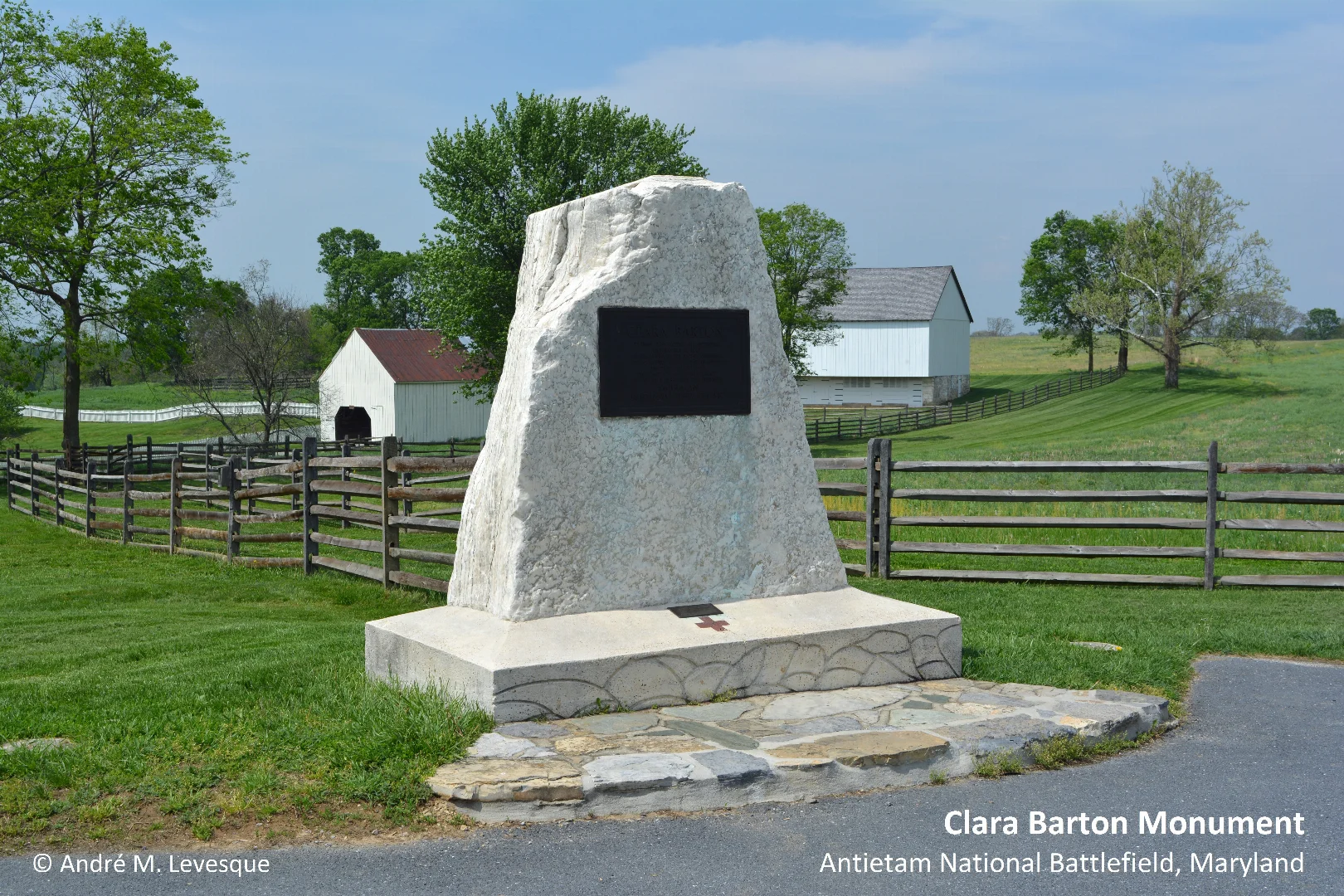 Shown in the photograph is the Clara Barton Monument at the Antietam National Battlefield which was dedicated on 9 September 1962. This granite monument was erected to honour her heroic actions during the Battle of Antietam, when on 17 September 1862, Clara Barton brought supplies and nursing aid to the wounded on this battlefield. As inscribed on the monument's commemorative plaque, "THIS ACT OF LOVE AND MERCY LED TO THE BIRTH OF THE PRESENT AMERICAN NATIONAL RED CROSS". Integrated into the base of the monument is a symbolic red cross that was made from a brick from the chimney of the home where Clara Barton was born at North Oxford, Massachusetts. This farmhouse, built by her father in 1818, was listed on the National Register of Historic Places in 1977.