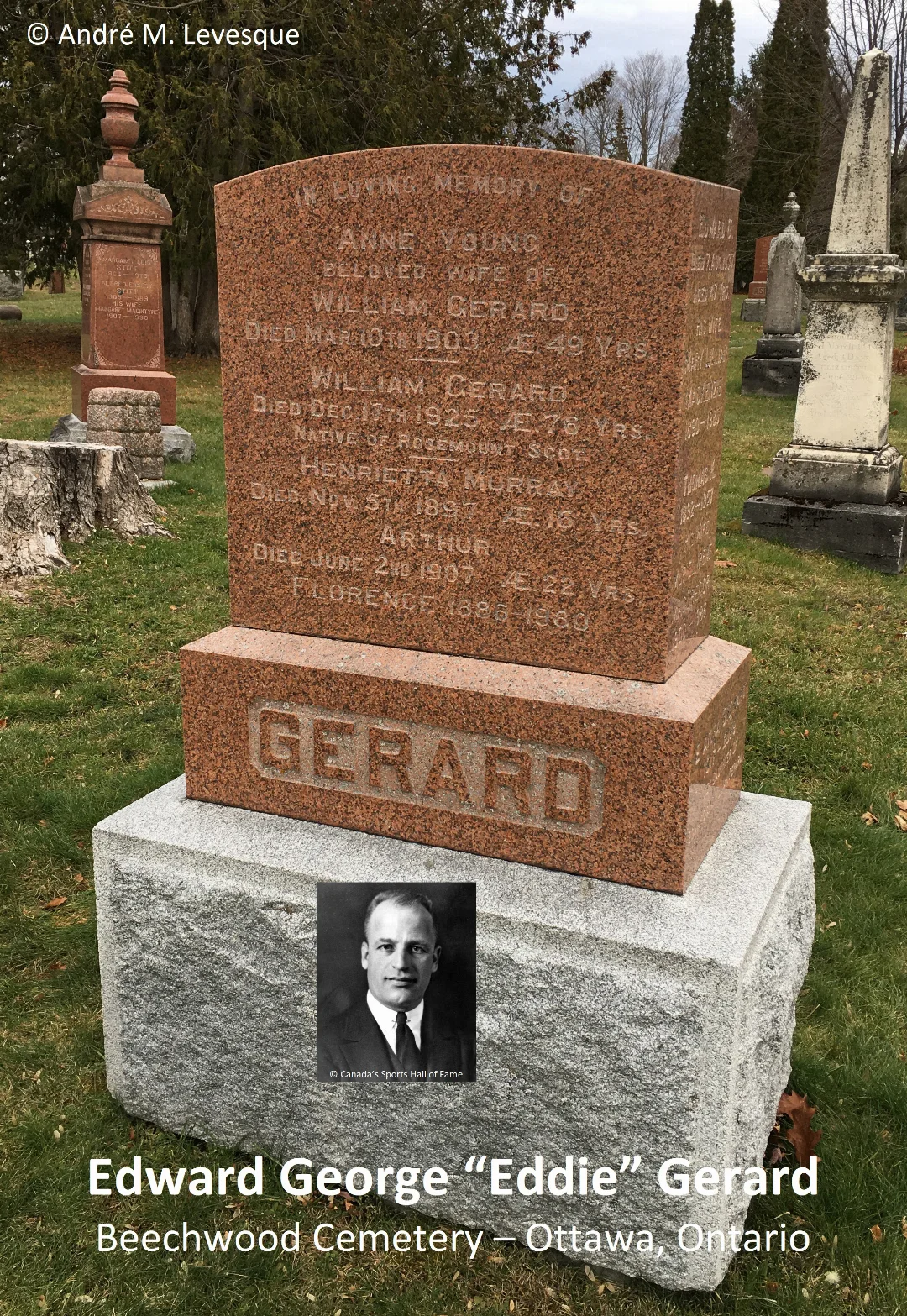 Eddie, his brothers John and Tom and their parents, William and Anne all lived on MacKinnon Road at the village of Rockliffe Park, located on the outskirts of Ottawa at the time. For many decades, all four houses were occupied by the Gerard family and as they have been living on that street since 1903, the Gerards are considered Rockliffe Park's longest resident family. Eddie Gerard died at the age of 47 and his early death was a great shock to many as "he never drank nor smoked and always kept himself in good physical condition." Team members, staff and citizens alike provided ample tributes following his death, include one from Frank "King" Clancy (25 February 1902 – 10 November 1986), former defence player with the Ottawa Senators and at that time with the Toronto Maple Leafs hockey team that summarized it best by saying: "In his death Ottawa loses one of her greatest hockey stars. Not only was he a great player but a wonderful inspiration to his team-mates." As shown in the photograph, he was buried at nearby Beechwood Cemetery in the family plot. Eddie Gerard was among the first nine players inducted into the Hockey Hall of Fame in 1945, two years after it was established in Toronto, Ontario. He also became a member of Canada's Sports Hall of Fame in 1975.
