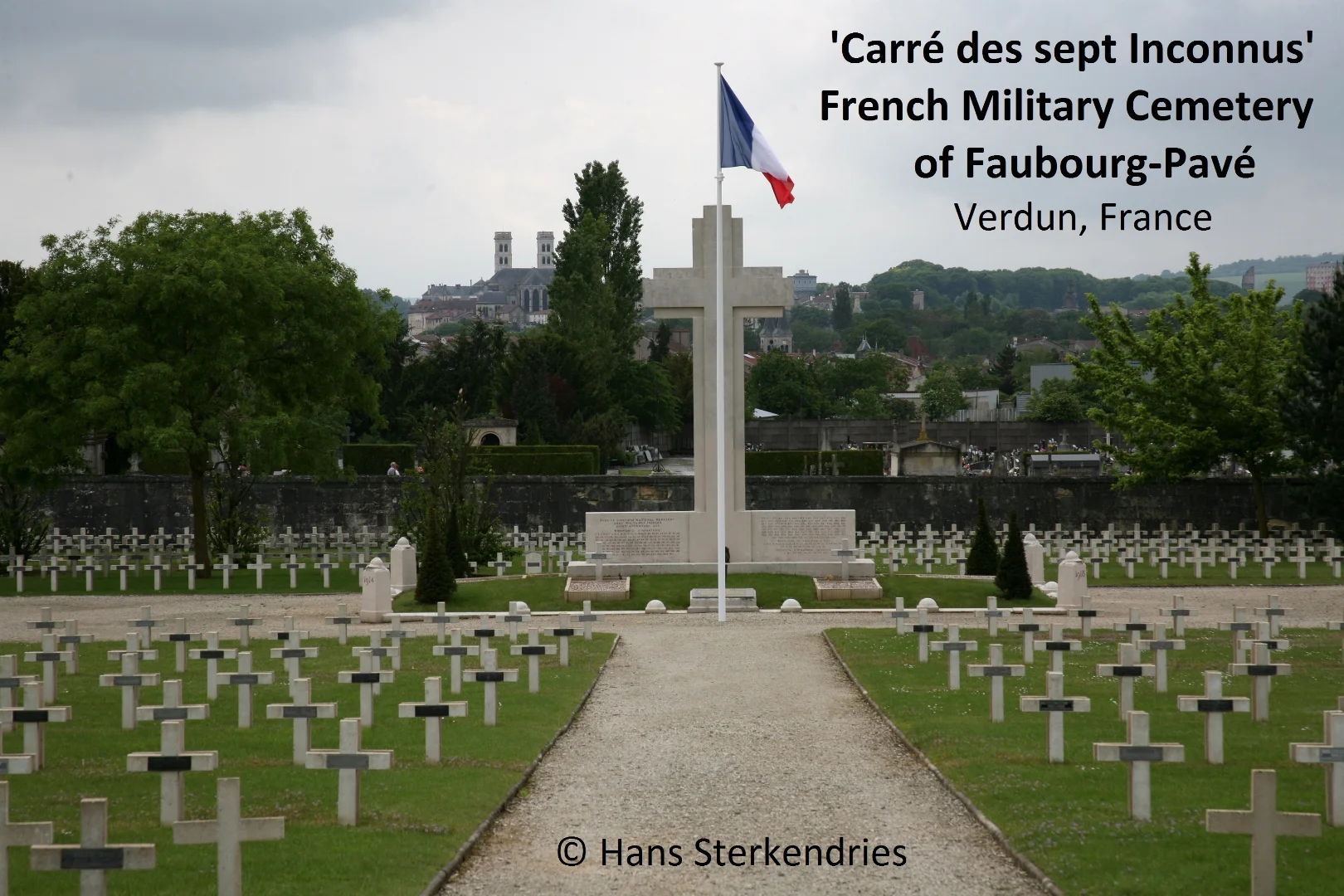 But what happened to the seven remaining unknown soldiers? The city of Verdun became responsible for the burial of the bodies. The city council immediately decided to create in the war cemetery of Faubourg-Pavé, one of the nineteen national necropolises of the Battle of Verdun, the 'Section of the Seven Unknowns' (Carré des sept Inconnus). Seven pits were dug around a large cross – three pits at the front, two behind and one on each side of the monument. As the French Unknown Soldier's journey from Verdun to Paris begun on 10 November 1920, the seven coffins remained until the next day in the Citadel of Verdun. Starting at 9 a.m., each coffin borne on a horse-drawn gun carriage left the fortress, escorted by soldiers of the garrison commanded by General Boichut (1864–1941), military, civil and religious authorities, veterans of the Great War and Franco-Prussian War of 1870, firefighters, railway workers as well as students and teachers. The procession moved slowly to the cemetery at the rhythm of several funeral marches, crossing the city of Verdun decorated with French flags. The seven unknown soldiers were interred after receiving full military honours. Today, 5,516 soldiers are buried at the Necropolis of the Faubourg-Pavé, of which 4,884 are from the First World War. Each corner of the 'Carré des sept Inconnus' is surmounted by a helmet representing symbols of the French army: artillery, light-infantry, colonial and infantry. The words "Soldat français inconnu mort pour la France" are inscribed on each grave. Since 2014, a Remembrance Flame is permanently lit on the site. Other unknown French soldiers are buried in the ossuary under the lantern tower at Notre Dame de Lorette near Arras.
