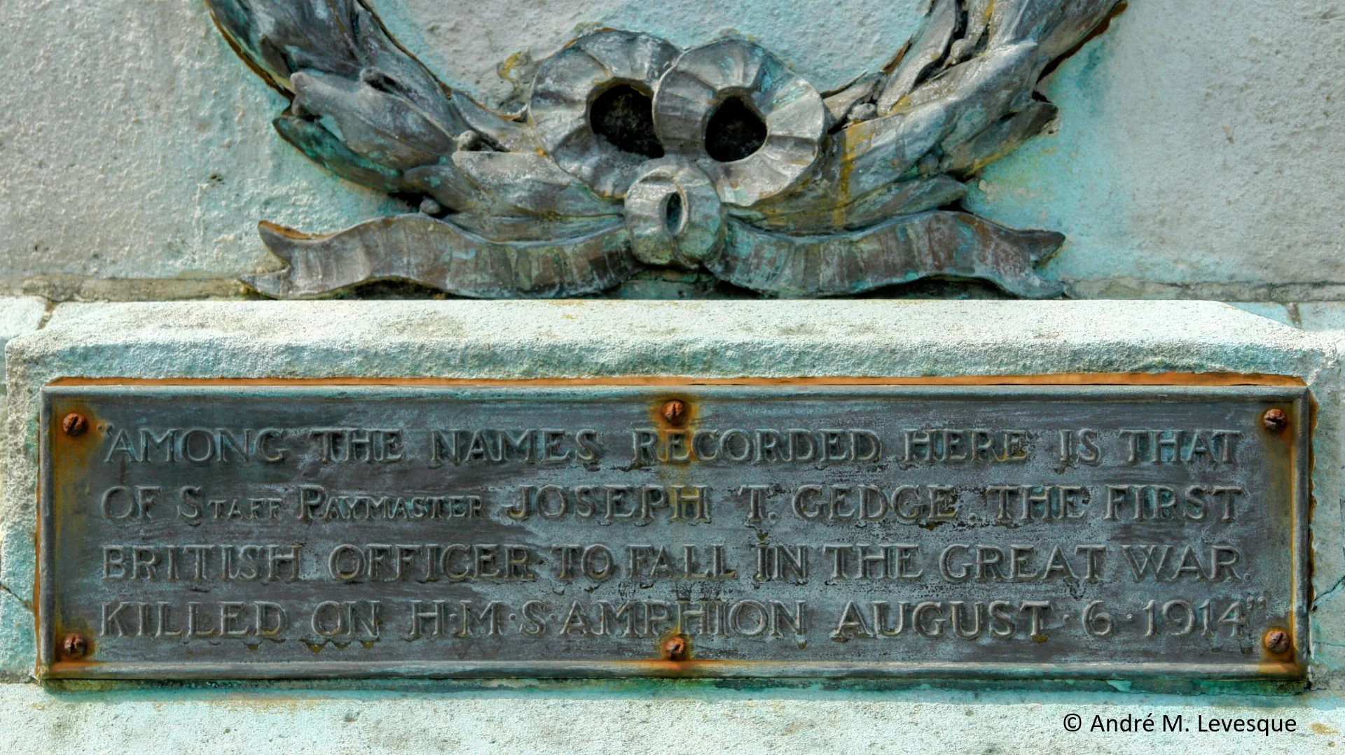 Depicted in the photograph is the Swanley War Memorial - unveiled in March 1922 and is located in Kent, approximately 15 miles southeast of central London, England, where it officially records Staff Paymaster Joseph T. Gedge as the first British officer to fall in the Great War. When his ship was sunk by a mine in the North Sea on 6 August 1914, there were 149 others who lost their lives, including Admiralty civilian George Jennings, a Canteen Server. Many from all walks of life enlisted and served in different ways.