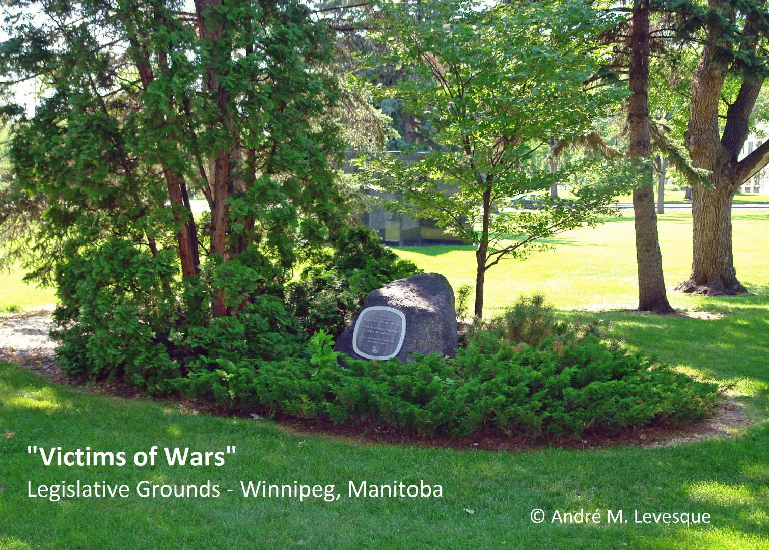 Shown in the photograph is "Victims of Wars" - a small grove and memorial boulder dedicated by the People of Manitoba "to the memory of all victims of wars" - "There is no way to peace. Peace is the way." This memorial - located on the Legislative Grounds, Winnipeg, Manitoba and dedicated on 6 August 1985 - is a constant reminder of the unintended consequences and impacts of wars.