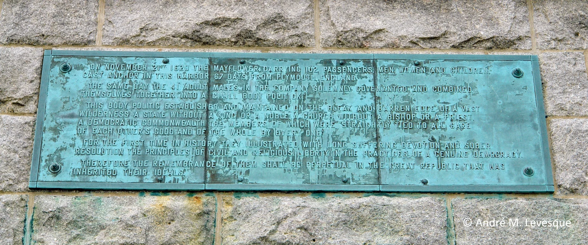"On November 21st, 1620 The Mayflower, carrying 102 passengers, men, women and children, cast anchor in this harbor 67 days from Plymouth, England. / The same day the 41 adult males in the company solemnly covenanted and combined themselves together "into a civil body politick." / The body politic established and maintained on the bleak and barren edge of a vast wilderness a state without a king or a noble, and church without bishop or a priest, a domestic commonwealth the members of which were "straightly tied to all care of each other's good and of the whole by every one." / For the first time in history they illustrated with long suffering dedication and sober resolution the principles of civil and religious liberty in the practice of a genuine democracy. / Therefore the remembrance of them shall be perpetual in the great republic that has inherited their ideals."