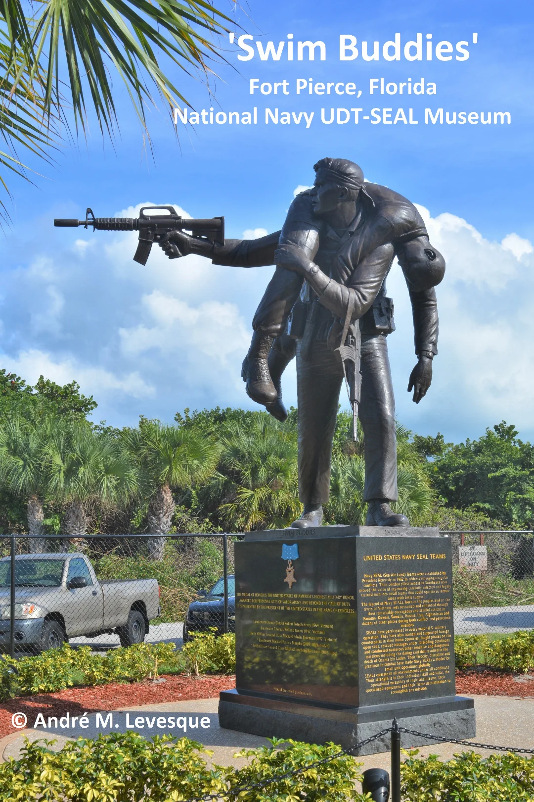 Situated at the entrance of the National Navy UDT-SEAL Museum in Fort Pierce, Florida is a ten-foot statue entitled 'Swim Buddies'.