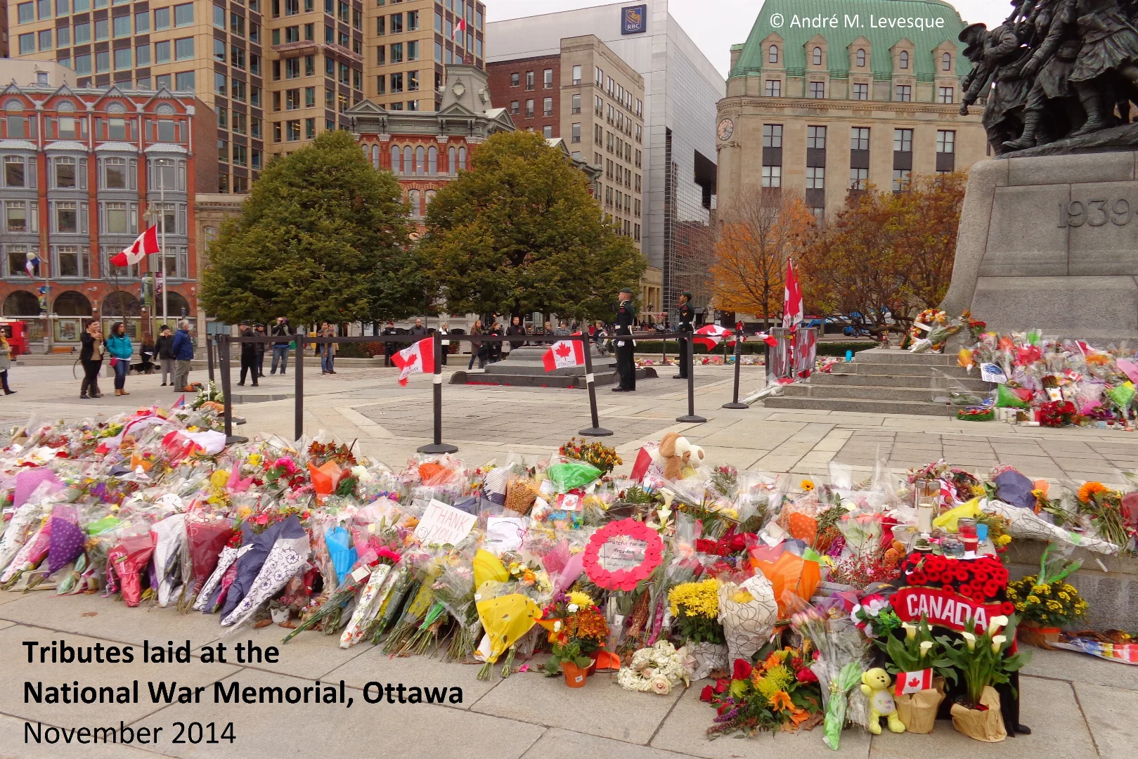 As shown in the photograph, Canadians had shortly after the Ottawa shooting demonstrated immense personal support to the victims and families of the terrible events by placing a wide variety of tributes all around the National War Memorial, including flowers, plants, wreaths, poppies, cards, flags and handmade crafts, among others. One year later, on the anniversary of the shooting attack, about 2,000 people gathered at the National War Memorial in Ottawa - including the families of Corporal Cirillo and Warrant Officer Vincent, Governor General David Johnston (28 June 1941 – ), outgoing Prime Minister Stephen Harper (30 April 1959 – ) and prime-minister-designate Justin Trudeau (25 December 1971 – ) – to honour the two soldiers killed, and to pay tribute to their families and the first responders who stepped in to help. Following the national event, a plaque to commemorate Cirillo's life was unveiled in a private ceremony at the southeast side of the memorial site.