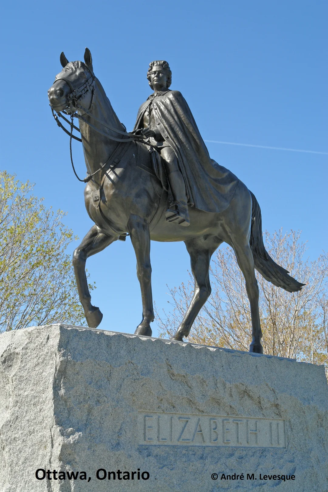 As shown in the photograph, a monument in honour of Queen Elizabeth II was unveiled on 1 July 1992 on Parliament Hill (Ottawa, Ontario) as part of Canada's 125th anniversary celebrations and marking the 40th anniversary of her accession to the Throne. The equestrian statue was commissioned by the Government in 1990 and was designed and created by Jack Harman (31 July 1927 – 3 January 2001), the successful artist selected from a national competition. Queen Elizabeth is featured on her horse, Centenial – a gift from Canada in honour of the 100th anniversary of the Royal Canadian Mounted Police – which was officially presented to Her Majesty in on 15 May 1977 at Windsor Castle. The bronze statue is one and a half times larger than life, standing at 4 metres tall. The base is made of granite from the Laurentians and measures 3.7 metres tall, 4.3 metres long and 1.5 metres wide. In total, the monument weighs 1225 kilograms. This was the world’s first equestrian statue of Her Majesty The Queen and is the only monument on Parliament Hill not erected posthumously. Due to the major rehabilitation of the Centre Block on Parliament Hill over the next 10 years, the Queen Elizabeth II Equestrian Monument was temporarily relocated in front of Rideau Hall's main gate on Sussex Drive and rededicated on 12 June 2019 by Her Excellency the Right Honourable Julie Payette (b. 20 October 1963), Governor General of Canada.