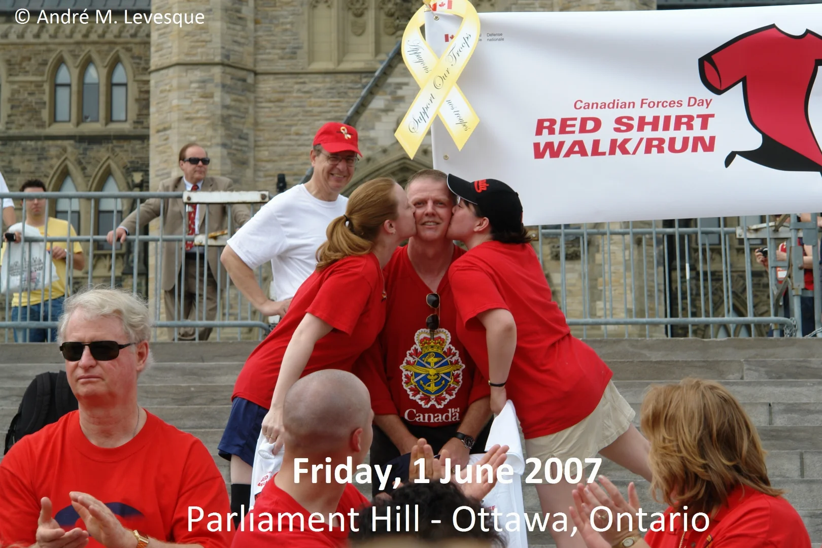 R.E.D. is an acronym that stands for Remember Everyone Deployed. What began as an email initiative throughout the United States since about 2003, the concept was simple: people across the country were encouraged to wear red every Friday to show their solidarity and support for American troops serving overseas and spread the message to the troops and their families that you are thinking of them. In May 2006, this grassroots movement inspired Lisa Miller and Karen Boire - two military wives from Petawawa, Ontario - to launch their own version of Red Friday and "present it in a more Canadian and personal way" and began promoting it within the local media. Lisa and Karen, also known as 'The Red Friday Ladies' held their first Red Friday Rally on Parliament Hill in Ottawa, Ontario in September 2006 and soon after, thousands of Canadians began the tradition of wearing Red on Fridays and their message was heard across the country. In turn, the efforts of our Red Friday Ladies also helped re-invigorate our American allies to further expand their Red Friday program. Shown in the photograph is then Chief of the Defence Staff, General Rick Hillier, being kissed by Karen Boire on the left and Lisa Miller on the right during a Red Shirt Walk/Run event that culminated on Parliament Hill on Friday, 1 June 2007.