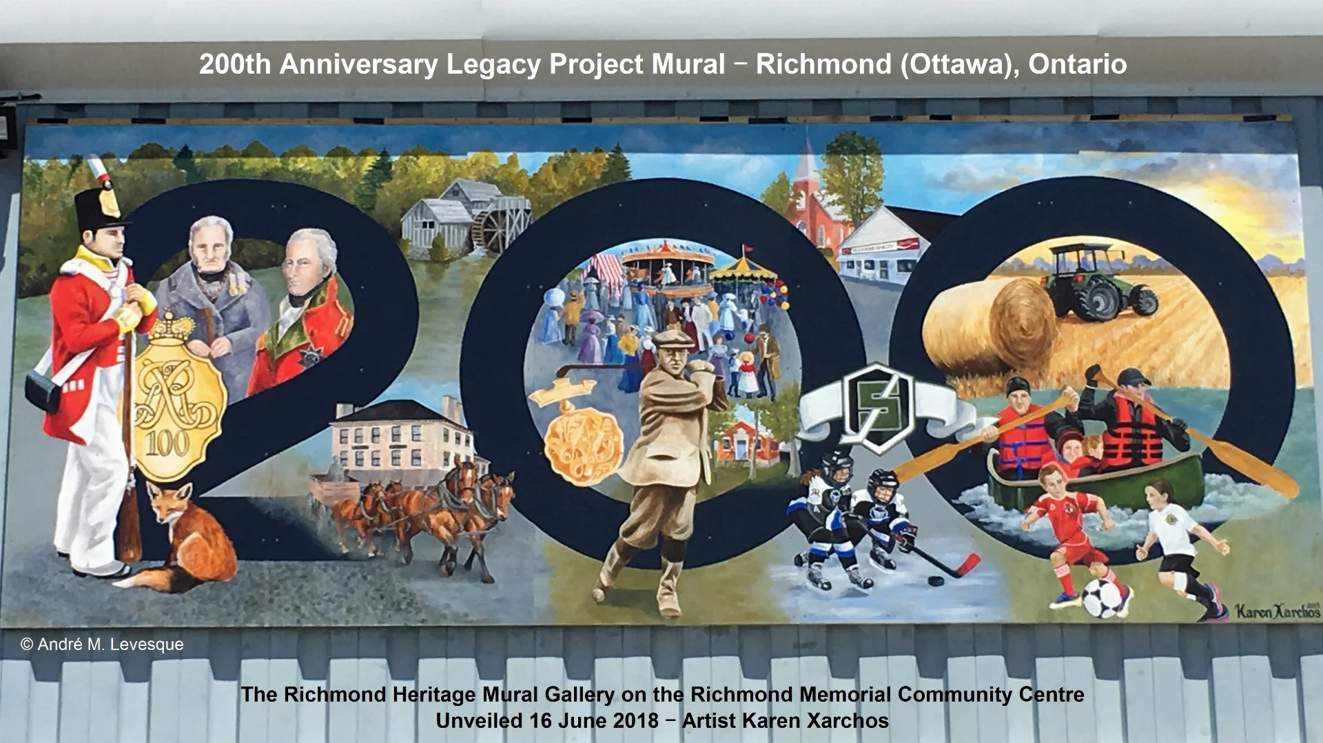 To commemorate Richmond's bicentennial, it added a 7th mural to their heritage mural gallery. Officially unveiled on 16 June 2018, Richmond artist Karen Xarchos included scenes depicting the founders of Richmond village, the 100th Regiment, the fox, early landmarks, milling, farming, the Jock River – known locally as the Mighty Jock, the annual Richmond Fair which goes back to 1844, George S. Lyon – the pride of Richmond – who captured Canada's last Olympic gold medal in golf, winning in 1904 at the age or 46, as well as other images of figures, iconic landmarks and symbols interspersed within the 20 foot wide by 8 feet high mural.