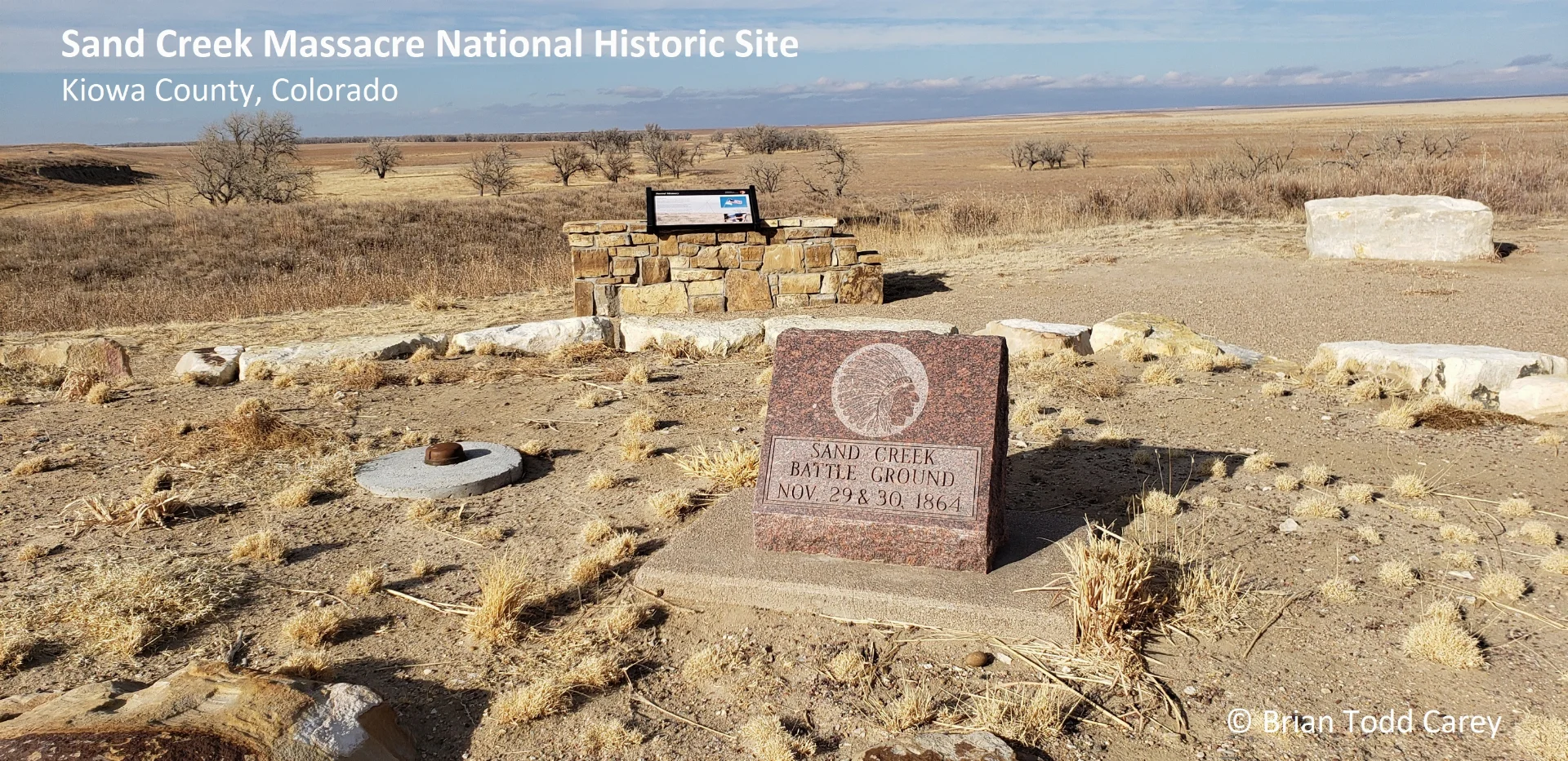 The U.S. Park Service established the location of the massacre as a National Historic Site effective 27 April 2007 with a dedication ceremony held the following day. Shown in the photograph is a commemorative marker erected in 1985 located on the ridge above the massacre site, a 640-acre area sacred to the Cheyenne and Arapaho Peoples off-limits to the general public.