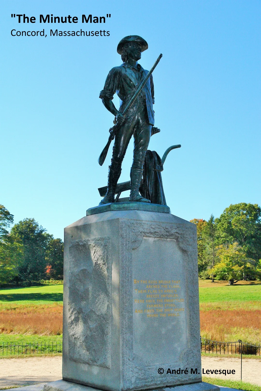 In 1872, a committee of citizens awarded a commission to Daniel Chester French (20 April 1850 - 7 October 1931), a 22 year old Concord man at the time, to create a monument commemorating the centennial anniversary of the battle at the North Bridge. As shown in the photograph, French chose a seven-foot-high figure of "The Minute Man" to be cast in bronze from Civil War cannons that had been melted down. The statue does not represent a particular person; it symbolizes a typical farmer who leaves his plow and picks up his musket to defend his land and liberty. French was paid $1,000 for the statue and it was unveiled as planned on 19 April 1875 in front of a large crowd and in the presence of distinguished guests such as President Ulysses S. Grant and poets Henry Wadsworth Longfellow and Ralph Waldo Emerson. It was noted that the sculptor was not present as he had already left to study in Europe. Carved onto the granite pedestal is the opening stanza of "Concord Hymn": "By the rude bridge that arched the flood,/ Their flag to April's breeze unfurled,/ Here once the embattled farmers stood,/ And fired the shot heard round the world." So while the first shots of the American Revolution were fired at Lexington, the "shot heard round the world" was fired in Concord to mark America's first victory in the fight for America’s independence. Emerson's historical revisionism has been a source of friendly debate for over a century between residents of Lexington and Concord on where is the official birthplace of the Revolutionary War. In 1894, the Massachusetts Legislature proclaimed 19 April as Patriots' Day as a civic holiday commemorating the anniversary of the Battles of Lexington and Concord. Up until 1969, the holiday was celebrated on the actual anniversary of the battles and afterwards has been observed on the third Monday in April.