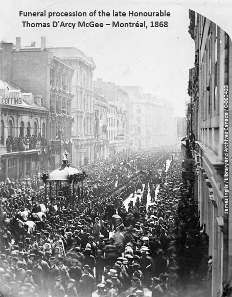 Unlike any other major funeral ceremonies held in Canada prior to Confederation, McGee was memorialized "in a pageant of unparalled solemnity and magnificence." After high-level funeral rituals held in Ottawa, his body was carried in a special train to Montréal for culminating tributes. Upon arrival, his coffin was escorted to his residence where it lay in state for three days followed by a heavily orchestrated funeral procession and competing obsequies in francophone and anglophone Catholic churches. As shown in the photograph taken by James Inglis (1835–1904), the custom-built horse-drawn funeral car was part of a cortège that included an estimated 10,000 people who marched through the streets and crowded with 60,000 to 100,000 spectators. With over 70 institutions and groups represented among the marchers, it was considered "extraordinary for its variety and inclusiveness.” Considering that McGee was a civilian, it was also highly unusual that troops from 23 units, including members from Ottawa and Québec, were invited to participate in the funeral. While he did not receive 'military honours', the volunteer presence of the military was in recognition and high regard of McGee's contributions to the shaping of his country.