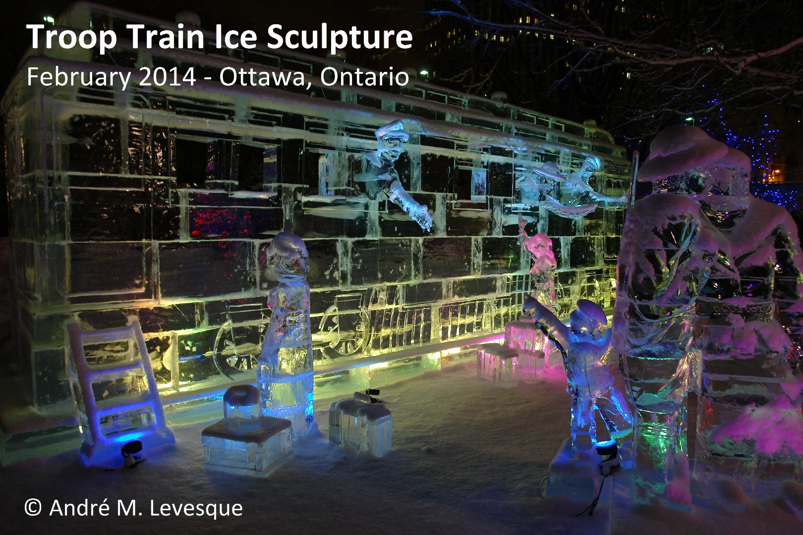 As a new form of transportation, railways were often used during times of war and peace. In Canada, one of the earliest known cases of troop movements by rail was to move British soldiers during the Lower Canada rebellion of 1837. In the United States, the railways played an important role during Civil War (1861–1865) as both sides required great mobility of troops and supplies. Due to its substantial network of rail lines and terminals, it provided a considerable advantage to the "Union" or the "North" in achieving final victory. With the rapid expansion of the Canadian West, it resulted in the construction of the new Canadian Pacific Railway (CPR) across the Prairies to eventually reach the Rockies. In 1885, in response to a provisional government established by Louis Riel (22 October 1844 – 16 November 1885), thousands of volunteer militia soldiers set off for North West Canada to suppress the rebellion. This included 53 men of the Ottawa Company of Sharpshooters who undertook a nine-day journey to Winnipeg on the still incomplete CPR – which today would take less than two days to travel the same distance. During the call to arms during the Great War, the use of troop trains was essential for transporting newly enlisted soldiers from across the country to the hastily prepared camp of Valcartier, Québec, the primary training base for the First Canadian Contingent for overseas service in 1914. It is here that over 35,000 troops trained and prepared for war. Shown in the photograph is an ice sculpture commemorating the centennial of the beginning of the First World War and depicts soldiers saying goodbye to their loved ones as they board a train to depart for war. The Troop train ice sculpture was unveiled on 6 February 2014 in Confederation Park – Ottawa, Ontario.