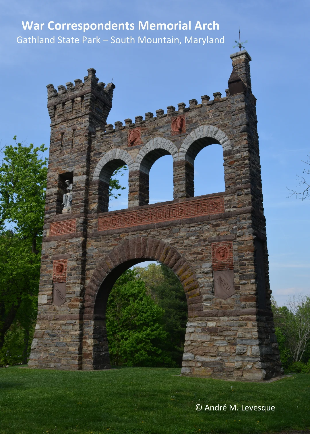 Although he remained living in the nation's capital for nearly two decades, in 1884 Townsend purchased a tract of land on South Mountain, Maryland, and established an estate, which he named Gapland. This area was particularly attractive to him because of its proximity to the Antietam Battlefield and Crampton's Gap, which witnessed a portion of the Battle of South Mountain, the first major battle of the Civil War fought in Maryland that included about 6,100 killed, wounded, and missing. It was on this estate that he built two years later the "War Correspondents Memorial Arch" - a permanent memorial to newspaper correspondents, artists, and photographers of the Civil War. Standing 50 feet tall and 40 feet wide, the Arch's unusual design was inspired by two Hagerstown structures: the former Baltimore & Ohio Railroad passenger depot which utilized a horseshoe-shape arch, and the Antietam Fire Co. Station No. 2 which incorporated a crenelated tower. Names of 157 men from the North and the South, who documented the Civil War, are inscribed in the east façade. The main Moorish arch is sixteen feet high built of Hummelstown purple stone, flanked to its north by a square tower with a cornerstone inscribed "Sept. 14, 62 - 96", for the date of the Battle of Crampton's Gap. A niche on the face of the tower holds a statue of Pan with the traditional pipes, and he is either half drawing or sheathing a Roman sword. Inset terra cotta busts are on both sides of the main arch over shields. On the left, the bust represents electricity, with the inscription "SPEED". On the right is the bust representing poetry, with the inscription "HEED". Above the main arch are three nine foot tall Roman arches made of limestone from Creek Battlefield, Virginia, representing Description, Depiction and Photography. Above these are inset two terra cotta horse heads. The unusual memorial was dedicated by Governor Lloyd Lowndes (1845-1905) on 16 October 1896 and in 1904 was turned over to the U.S. War Department. The memorial was repaired during the Great Depression sometime between 1934 and 1936 and in 1949, it was deeded to the State of Maryland to be administered as a State Park by the Department of Forests and Parks and continues to be maintained by the National Park Service. The estate was renamed Gathland State Park, using Townsend's popular pen name. This memorial remained the sole memorial dedicated to war correspondents for a period of 90 years until the "War Correspondents Memorial" oak tree was unveiled by the National Press Club at Arlington National Cemetery on 7 October 1986 "in memory of journalists who died while covering wars or conflicts for the American people." Exactly two decades later, on 7 October 2006, a "Memorial to Reporters" was inaugurated in Bayeux, France to commemorate all those reporters and journalists killed while carrying out their work across the world since 1944.