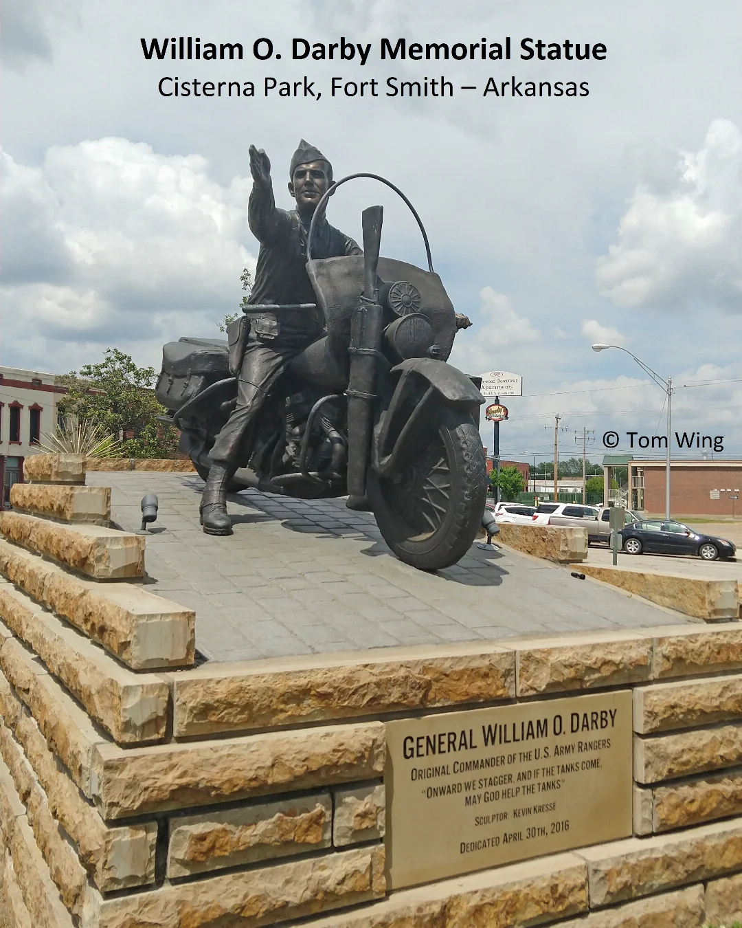 Darby was first buried near Cisterna, Italy but was reinterred in the Fort Smith National Cemetery on 11 March 1949. On 30 April 2016, a statue commemorating his accomplishments was erected in Cisterna Park in downtown Fort Smith. Joe Armstrong, a retired Ranger and wife Liz led an effort to get funding for the 2,500-pound monument. As seen in the photograph, the bronze memorial statue depicts Darby on a motorcycle and gesturing a "forward" signal with his right arm. The Darby Legacy Project called upon artists requesting bids, then met with six separate artists to discuss concepts. The group members eventually selected Little Rock sculptor Kevin Kresse. The total cost for the monument was around $250,000. Guest Speakers at the dedication included Dr. Darren McKinney, principal of Darby Junior High School at the time and also chairman of the Darby Legacy Project; Major General William Wofford, a retired adjutant general with the Arkansas National Guard, a former Ranger himself along with his son; and Darby Watkins, the nephew of General Darby, who is also the family's historian and son of General Darby's younger sister, who was born in 1928 when he was 17 years old. As Brigadier General William Orlando Darby led by his example, his Rangers continue today to "Lead the Way."